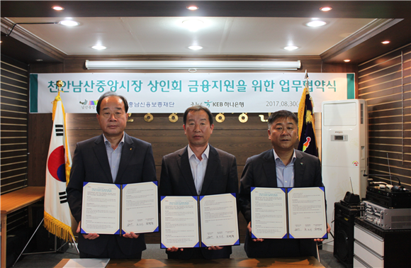 [프라임경제] 충남신용보증재단(이사장 정철수)은 천안 남산중앙시장 소기업·소상공인 사업자금 지원을 위해 남산중앙시장 상인회와 KEB하나은행과 30일 전통시장 소기업·소상공인 금융지원 강화를 위한 업무협약을 체결했다.
