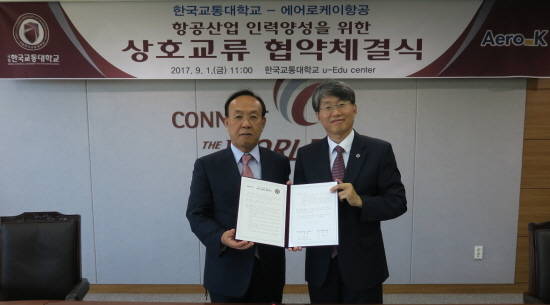 충청북도 충주시 한국교통대에서 진행된 협약식에는 에어로 K 이호일 부사장과 한국교통대 이병찬 교무처장이 참석해 조종사 양성을 위한 산학협동에 뜻을 같이 했다.