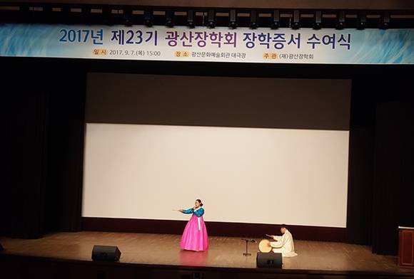 장학금 수여식에 앞서 이번 제23기 장학생으로 선발된 김근희 양(전남대 2년)이 재능기부로 국악공연을 진행해 참석자들로부터 큰 호응을 이끌어 냈다.