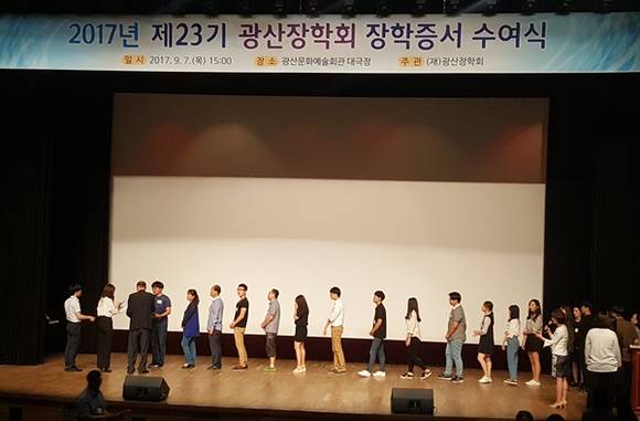 이날 오후 3시 광산문화예술회관에서 강박원 이사장, 민형배 광산구청장, 이동규 미래에셋대우 광주센터장, 시·구의원, 장학생, 학부모, 주민 등 200여 명이 참석한 가운데 '2017년 23기 광산장학회 장학증서 수여식'을 열고 중·고·대학생 113명에게 장학금을 수여했다.