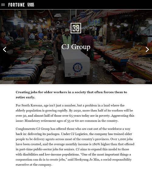 포춘은 선정 이유에 대해 "인구 고령화가 글로벌 사회적 이슈로 대두되는 가운데 CJ그룹은 CJ대한통운의 실버택배를 통해 양질의 노인 일자리를 창출하고 노인 빈곤문제를 해소하는 데 기여했다는 점에서 높은 점수를 받았다"고 밝혔다.