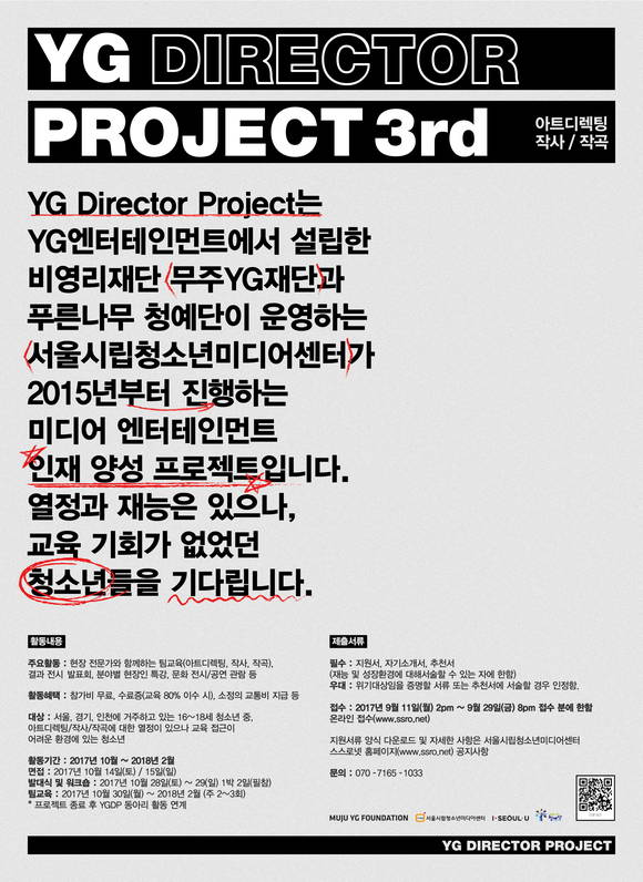 [프라임경제] YG엔터테인먼트 설립 비영리재단인 무주YG재단과 재단법인 푸른나무 청예단이 운영하는 서울시립청소년미디어센터가 공동기획한 인재 양성 프로젝트 'YG 디렉터 프로젝트(YG Director Project)'가 3기 참가자를 모집한다.