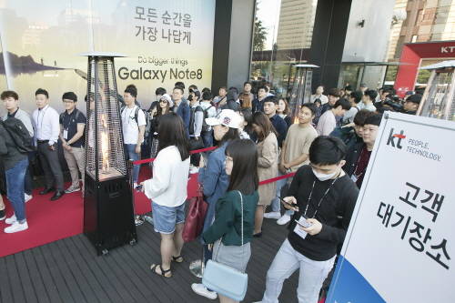 한편 KT(030200)도 이날 서울 광화문에 위치한 KT스퀘어에서 갤럭시노트8 개통행사를 열었다. 걸그룹 '레드벨벳'을 초청해 고객을 맞이하고 사인회도 열었다.