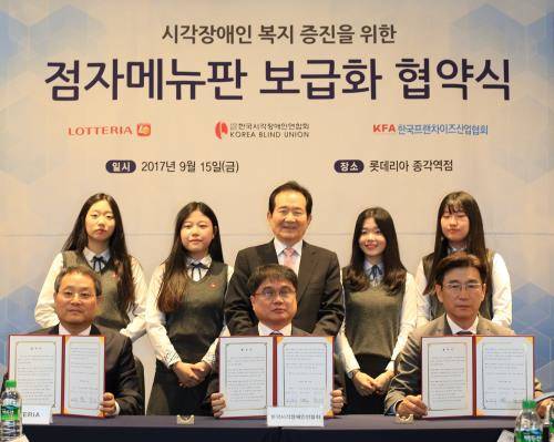 이날 협약식은 정세균 국회의장, 이병돈 한국시각장애인연합회장, 박기영 한국프랜차이즈협회장, 노일식 롯데지알에스 대표가 참석한 가운데 진행됐다.