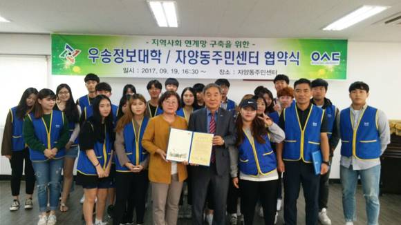 김숙례 자양동장은 "지역사회와의 상생을 위해 노력하는 정상직 우송정보대학 총장을 비롯한 교수, 학생들께 깊은 감사를 드린다"며 "이번 협약 체결이 자양동에 거주하고 있는 소외계층을 위해 학생들이 자신의 재능을 적극 발휘할 수 있는 계기가 되길 바란다"고 말했다.