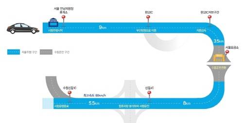SK텔레콤은 자사가 개발 중인 자율주행차가 21일 오전 서울 만남의 광장부터 수원신갈 나들목(IC)까지 약 26 km의 경부고속도로 구간에서 시험 주행을 성공했다고 밝혔다.