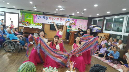 지난 8월10일에는 벨리댄스팀(회장 조현진, 강사 김미선)이 심청노인복지센터에서, 9월15일에는 한우리예술단(단장 전승길, 강사 한순임)이 기차마을 로즈홀에서, 9월19일에는 옥과난타 스타반(회장 정채님)은 흥산보금자리에 방문하여 그동안 갈고 닦은 실력을 맘껏 발휘하며, 어르신들과 즐거운 한때를 보냈다.