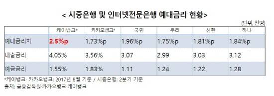 25일 국회 정무위원회 이학영 의원(더불어민주당·경기군포 을)이 금융감독원 및 케이뱅크, 카카오뱅크로부터 제출받은 자료에 따르면 케이뱅크의 예대금리차는 2.5%로 시중은행 및 인터넷전문은행 전체를 통틀어 가장 크다.
