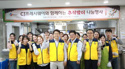CJ프레시웨이 임직원들은 종로구 이화동에 있는 종로노인종합복지관에 모여 한과·식혜 등 추석 간식을 넣은 선물꾸러미를 만들어 해당 복지관을 찾은 어르신 600여명에게 전달하고, 복지관 경로 식당을 이용하는 노인들을 위해 점심 식사도 마련했다.