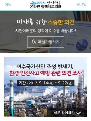 이어 이달 14일부터 22일까지 '여수국가산단 환경·안전사고 예방'과 관련한 두 번째 설문조사도 진행됐으며 다음 달 초에는 '2017 여수밤바다 불꽃축제 시민만족도 및 개선방안'에 대한 설문조사를 준비한다.