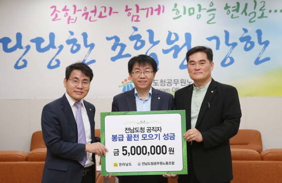 성금은 전라남도와 도청 노동조합이 공동 추진하는 '봉급 끝전모아 이웃사랑 운동'을 통해 모은 것이다. 지난 2013년부터 시작해 현재 1650여명의 공직자가 자발적으로 참여하고 있으며 이날 성금 전달식에서 이재영 권한대행도 원천징수동의서에 서명한 뒤 뜻을 같이했다.