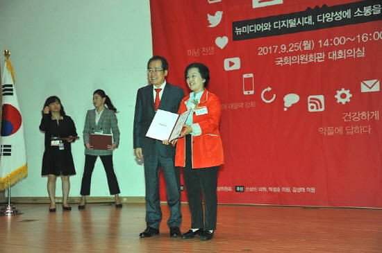 [프라임경제] 김영선 새경남발전포럼 대표가 25일 오후 국회의원회관 대회의실에서 열린 자유한국당 디지털정당위원회 출범식에 참가해 홍준표 당대표로부터 고문 임명장을 수여받았다.