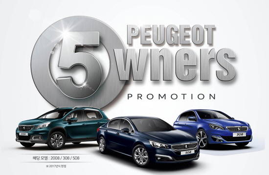 [프라임경제] 한불모터스는 푸조와 시트로엥 대표모델 구매고객을 대상으로 차량구입과 구입 후 5년 동안의 유지비용 부담을 낮춘 '오너스(5 Owners)' 특별 프로모션을 실시한다고 27일 밝혔다.