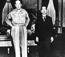 일명 '천황제도'를 유지하는 대신 일본이 미국의 이해관계에 철저히 굴종하겠다는 모종의 합의 후 선언적으로 공표한 사진이죠. 신처럼 추앙받던 일왕이 모범생처럼 찍힌 반면, 명문가 출신의 미군 장성은 자신만만하게 손을 허리에 짚고 서 일본인들에게 대단한 충격을 줬죠.
