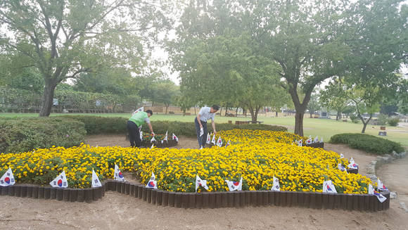 태극기 꽃동산은 다음달 1일 제69주년 국군의 날과 3일 제4349주년 개천절을 맞아 나라사랑 태극기 달기 운동의 일환으로 조성됐다.