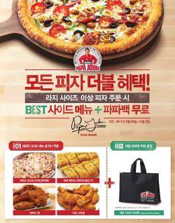파파존스 모든 피자 더블혜택 이벤트는 오는 29일부터 내달 5일까지 피자 종류를 한정하지 않고 라지 사이즈 이상 모든 피자 구매 고객을 대상으로 두 가지 선물을 제공한다.