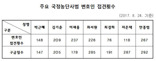 최순실씨 역시 285일 동안 294차례 변호인 접견을 했고, 이재용 삼성전자 부회장은 178일 동안 214회, 김기춘 전 청와대 비서실장 205일 동안 258회로 모두 구금일수보다 변호사와 접촉한 횟수가 더 많았다.