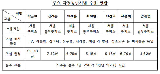 박 전 대통령뿐 아니라 △김기춘 전 비서실장(7.33㎡·약 2.22평) △이재용 부회장 △차은택 전 창조경제추진단장(각 6.76㎡·약 2.04평) 역시 일반 수용자 대비 넓은 혼거실에 머물고 있다.