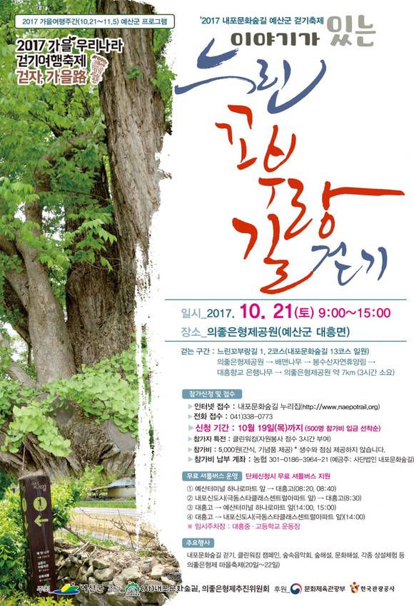 예산군이 주최하고 (사)내포문화숲길이 주관하는 이번 걷기 행사는 올해 3월 문화체육관광부와 한국관광공사가 공모한 걷기 축제 공모에 선정돼 추진된다.