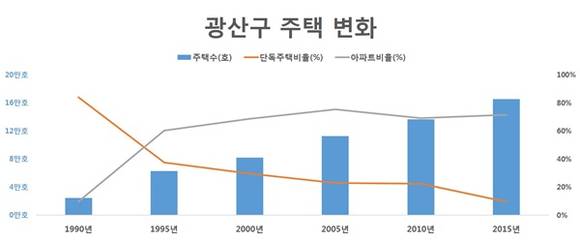 늘어난 것에 비해 줄어든 것도 있다. 바로 주택분야다. 1990년 광산구 단독주택 비율은 전체 주택의 83.9%(2만489호)였다. 그러나 2015년 단독주택은 전체의 9.4%(1만5497호)로 줄었다. 감소한 단독주택 자리에는 아파트가 들어섰다. 광산구에서 아파트는 1990년 9.8%(2394호)에서 2015년 71.4%(11만8020호)로 급등했다.
