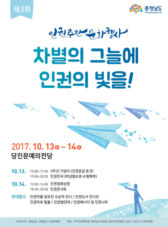 [프라임경제] 충남도는 오는 13∼14일 당진 문예의 전당에서 '차별의 그늘에 인권의 빛을'을 주제로 '제3회 인권주간 문화행사'를 개최한다고 11일 밝혔다.