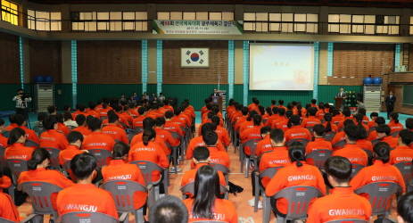 [프라임경제] 장휘국 광주시교육감은 11일 광주체육고등학교 무등관에서 열린 제98회 전국체육대회 광주체육고 선수단 결단식에 참석해 학생 선수들을 격려하고 부상 없이 안전한 대회가 되기를 기원했다. 체육고 학생들은 공정하게 경기에 임하겠다는 선서문을 낭독한 후 대회 선전을 다짐했다.