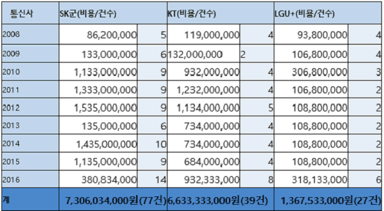 11일 국회 과학기술정보방송통신위원회 김성수 의원(더불어민주당·비례)이 KISDI로부터 제출받은 '2008~2016년 정부수탁 및 민간수탁 연구비 현황'에 의하면 통신3사와 자회사는 KISDI에 9년간 총 153억690만원을 지급했다. 연간 약 17억원이 투입된 셈이다.