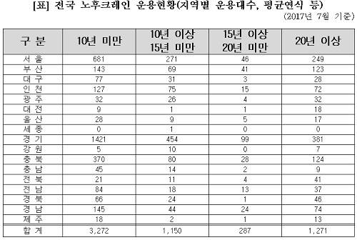 11일 환경노동위원회 소속 김삼화 의원(국민의당)이 국토교통부로부터 제출받은 전국 노후크레인 운용현황 자료에 따르면 현재 운용 중인 크레인 중 연식이 20년 이상 된 노후크레인이 비중이 무려 21.3%에 달하는 것으로 나타났다. 다섯 대 중 한 대인 셈이다.