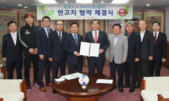 또 장종태 SK하이닉스 청주지원본부장은 "청주시의 적극적인 협조로 연고지 협약을 체결하게 돼 감사드린다"며 "비인기종목인 핸드볼 활성화를 위해 지역과 소통하는 기회를 자주 마련해 청주시민에게 사랑받는 모범구단이 되도록 노력하겠다"고 말했다.