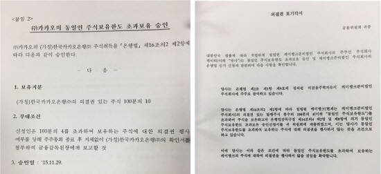 KT와 카카오는 이 같은 내용으로 각각 우리은행·NH투자증권, 한투금융지주 등과 주주 간 계약을 맺으면서 금융위에 예비인가를 신청할 때는 "지분율 4% 이상에 대한 의결권을 포기한다"는 각서를 냈다.