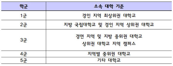 경인 지역 최상위권 대학교를 '1군'으로 세웠고 △2군 지방국립대학교 및 경인 상위권 대학교 △3군 경인 및 지방 중위권 대학교 및 상위권 대학교 지역 캠퍼스 △4군 지역별 중위권 대학교 △5군 기타 대학교 순이었다.