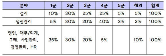 반대로 생산관리 등 현장직에는 △4군 40% △2군 30% △1군 5% △5군 3% △해외 대학 2% 순으로 합격비율을 맞췄다. 대학 간판에 따라 능력과 무관하게 서류전형 결과가 결정되는 셈이다.