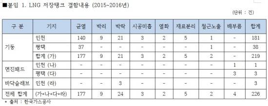 18일 국회 산업통상자원중소벤처기업위원회 소속 이훈 더불어민주당 의원이 가스공사로부터 제출받은 자료에 따르면 지난 2015년부터 지난해까지 인천 및 평택기지본부의 LNG 저장탱크를 점검한 결과 총 226건의 결함이 발생한 것으로 나타났다.