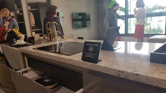 아파트 전용면적 84㎡의 경우 수납공간이 넉넉하게 확보된 점이 눈에 띠었다. 주방 맞은편에 설계될 팬트리 장은 선반형태, 창고형태로 나뉘어 디자인돼 다양한 수납이 가능해 보였다. 한샘 키친바흐와 콜라보레이션을 통해 특화 설계된 주방(유상옵션)도 돋보였다. 아일랜드 풍 식탁으로 조리 후 바로 식사가 가능한 동선으로 꾸며졌다.