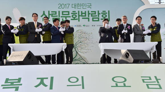 [프라임경제] 김재현 산림청장(오른쪽 세번째)이 20일 경북 영주시 가흥로 서천둔치에서 열린 '2017 대한민국 산림박람회'에서 주요 참석자들과 비둘기 날리기 퍼포먼스를 하고 있다.