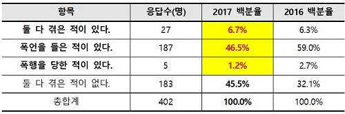 서형수 의원실과 알바노조가 2주간(9월20일~10월3일) 편의점 아르바이트 노동자 402명을 대상으로 설문조사한 결과에 따르면 전체의 54.4%가 폭언·폭행을, 12.9%가 성희롱·성폭행을 경험한 것으로 파악됐다.