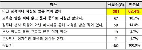 하지만 열악한 노동환경과 업무 스트레스에도 불구하고, 안전 및 범죄 대처를 위한 교육은 미비한 것으로 나타났다. 지난해 발생한 편의점 살인사건 등으로 인해 심야안전을 우려하는 목소리가 큰 가운데 62.4%가 어떤 교육이나 지침도 받은 적이 없다고 응답했고, 교육을 받은 적이 없고 문서 등으로 지침만 받았다고 응답한 비율도 16.7%에 달했다.