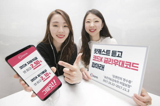 [프라임경제] 케이뱅크가 내달 3일까지 팟캐스트 인기방송 '김생민의 영수증'과 '송은이&김숙의 비밀보장'에서 코드K 예·적금 상품의 금리우대코드를 발급한다.