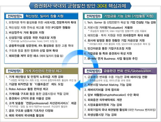 현재 국내 증권사는 해외IB와는 경쟁력에서 격차가 있고 국내 금융시장에서는 역할이 제한적인 상황이다. 이에 협회는 업무·영업환경, 제도적으로 어떤 불합리한 부분이 있는지 분석하고 이를 바로 잡고자 올해 초부터 증권사 균형발전 방안을 마련했다.