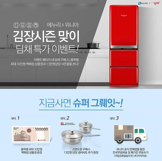 에누리 가격비교는 자사 홈페이지를 통해 대유위니아 김치냉장고 인기 브랜드 '딤채'의 2017년 뚜껑형 인기 1위 제품을 구매하는 고객에게 최대 10만원의 백화점 상품권을 증정한다. 스탠드형 김치냉장고 구매 고객에게는 13만원 상당의 냄비세트도 추가 증정한다.