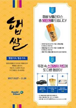 [프라임경제] 현대오일뱅크는 오는 27일부터 다음달 26일까지 주유소 이용고객 50만명을 대상으로 800g짜리 햅쌀을 증정하는 '햅쌀가득 행운가득 프로모션'을 진행한다고 26일 밝혔다.