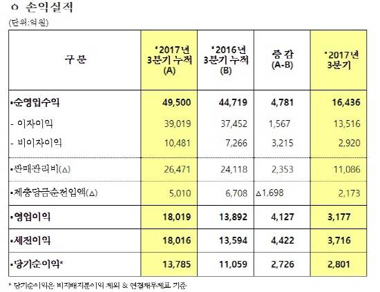 이자이익은 3분기에만 3.1%에 달하는 성장을 보인 저비용예금 증가와 기업 및 가계의 균형있는 대출성장에 힘입어 증가추세를 유지했다.