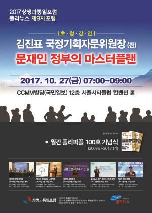 [프라임경제] 상생과통일포럼과 폴리뉴스가 공동 주최하는 제9차 포럼 '문재인 정부의 마스터플랜'이 오는 27일 오전 7시부터 9시까지 서울 여의도 CCMM빌딩(국민일보) 12층 서울시티클럽 컨벤션홀에서 열린다.
