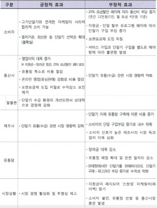 반면 소비자에게는 긍정적 효과보다 부정적 효과가 더 큰 것으로 분석됐다. 과기정통부는 소비자 측면에서 긍정적인 기대효과로 꼽히는 고가단말기와 연계한 마케팅 제거로 합리적 소비 가능, 중저가폰·외산폰 등 단말기 선택권 확대 두 가지는 인정했다. 다만 단말기 선택권 확대에 대해선 불확실하다고 부연했다.