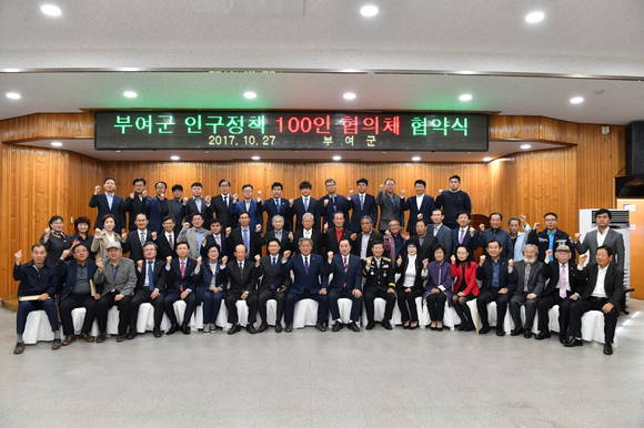 군은 27일 여성문화회관에서 24개 기관장(경찰서, 소방서, 교육지원청 등)과 32개 관내 기업체, 44개 단체장(부여군여성단체협의회 등) 등 총100명이 참석한 가운데 부여군 인구증가 정책 추진을 위한 민관협의체 구성 및 협약식을 진행했다.