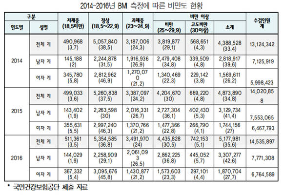 비만인구는 2014년 이후 꾸준히 늘고 있다. 전체 수검인원 중 33.4%였던 것이 이듬해 34.8%로 증가했고 올해 35%를 돌파했다. 반면 정상체중인 경우는 점점 줄어 2014년 전체 수검인원의 38.5%였던 것이 2015년 37.5%, 지난해 36.8%까지 감소했다.