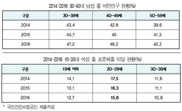 19세 이하는 12.7%, 30대 10.8%가 저체중이었는데 다행인 것은 2014년 17.5%였던 20대 저체중 비율이 이듬해 16.3%에 이어 꾸준히 하락하고 있다는 점이다.