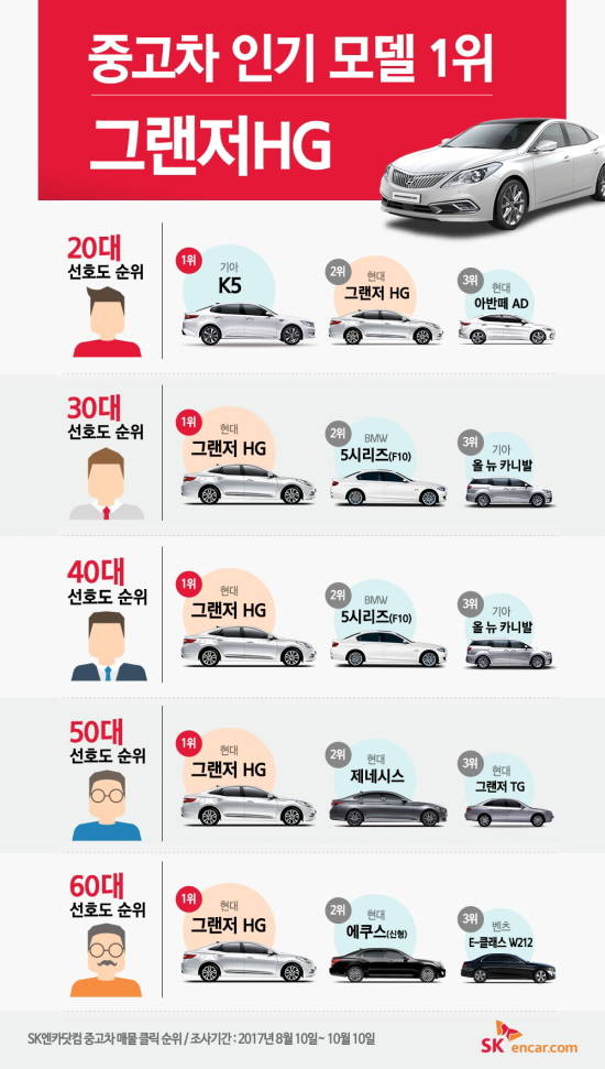 SK엔카닷컴은 지난 8월10일부터 10월10일까지 SK엔카닷컴의 중고차 매물 클릭수를 연령별로 집계한 결과, 현대차의 그랜저HG가 30~60대 사이에서 모두 1위를 기록하며 가장 인기 있는 중고차로 꼽혔다고 30일 밝혔다.