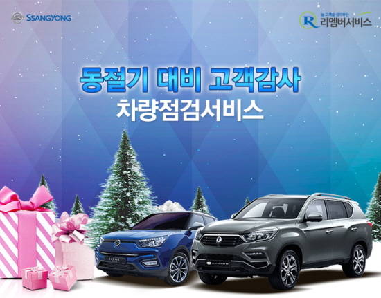 [프라임경제] 쌍용자동차(003620)는 동절기를 대비한 무상점검 서비스 캠페인 '겨울맞이 고객감사 리멤버 서비스'를 실시한다고 30일 밝혔다.