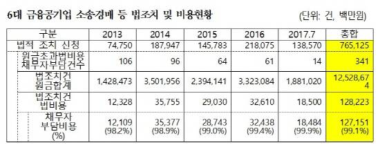 일례로 한국자산관리공사의 경우 2013년부터 2017년 7월까지 고문변호사들에 지급한 수수료가 총 311억원에 이른다. 이는 발생한 법조치 비용의 1/3에 해당하는 금액이다.